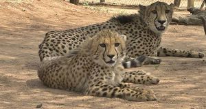 B2, le dernier orphelin recueilli par le Cheetah Conservation Fund en Namibie (âgé de 7 mois) a été mis en présence de Phoenix (orphelin élevé au biberon âgé de 6 ans) qui était seul depuis la perte de ses deux compagnons. Tous deux se portent bien ! Tous sont très enthousiastes de les voir s'acclimater l'un à l'autre. C'est un processus lent. Chaque jour, ils sont mis en présence l'un de l'autre quelques heures et ils sont surveillés attentivement.